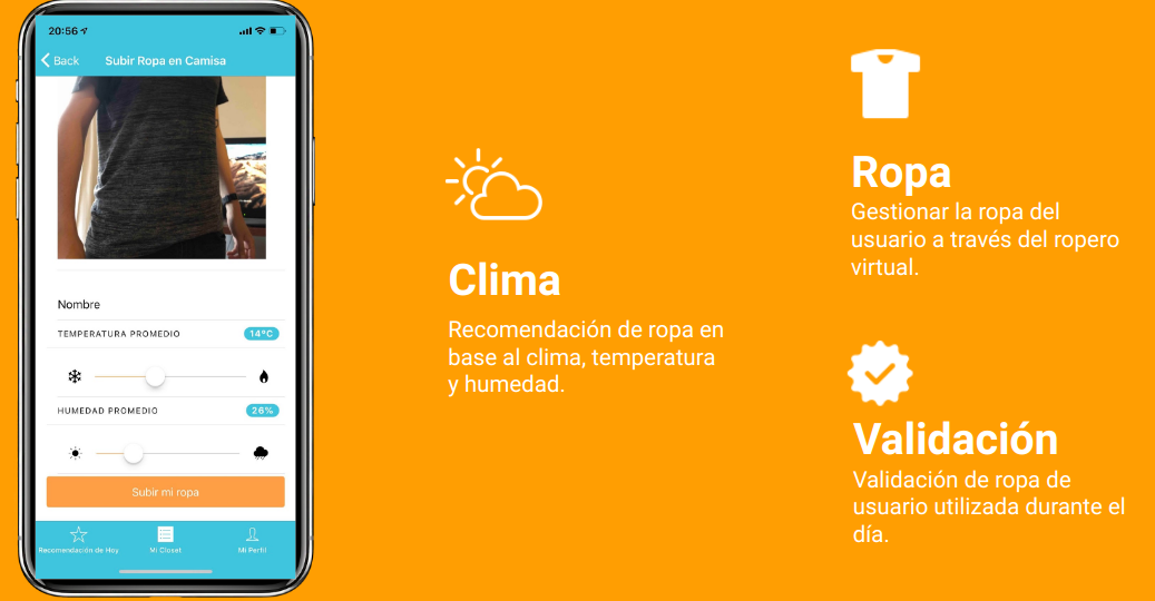 Cloty es una aplicación Mobile que funciona en segundo plano, es decir, la lógica del producto final es que como usuario final programes una hora prudente en donde cloty te dirá la temperatura de hoy en tu ciudad y te dará un set de recomendaciones de outfit. Esto será notificado a tu celular a través de una notificación push. Puedes aceptar uno y rechar el resto. La idea original es que mediante el feedback que entrega el usuario informando al sistema si usó el atuendo o no, vaya alimentando una red neuronal la cual aprenderá de tus gustos y perfeccionará las elecciones futuras.